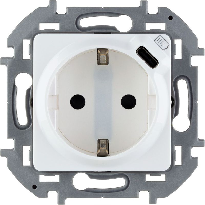 Комбинированная розетка 2К+З с зарядным устройством USB тип С Inspiria для скрытого монтажа, цвет "Белый". Максимальный ток розетки 16АХ, напряжение розетки ~250В, напряжение зарядного устройства =5В, максимальный зарядный ток 1500 мА. Применяется для одновременного электропитания бытовых потребителей и зарядки мобильного устройства. Оснащена интегрированными шторками, которые защищают детей и других пользователей от удара электрическим током.
