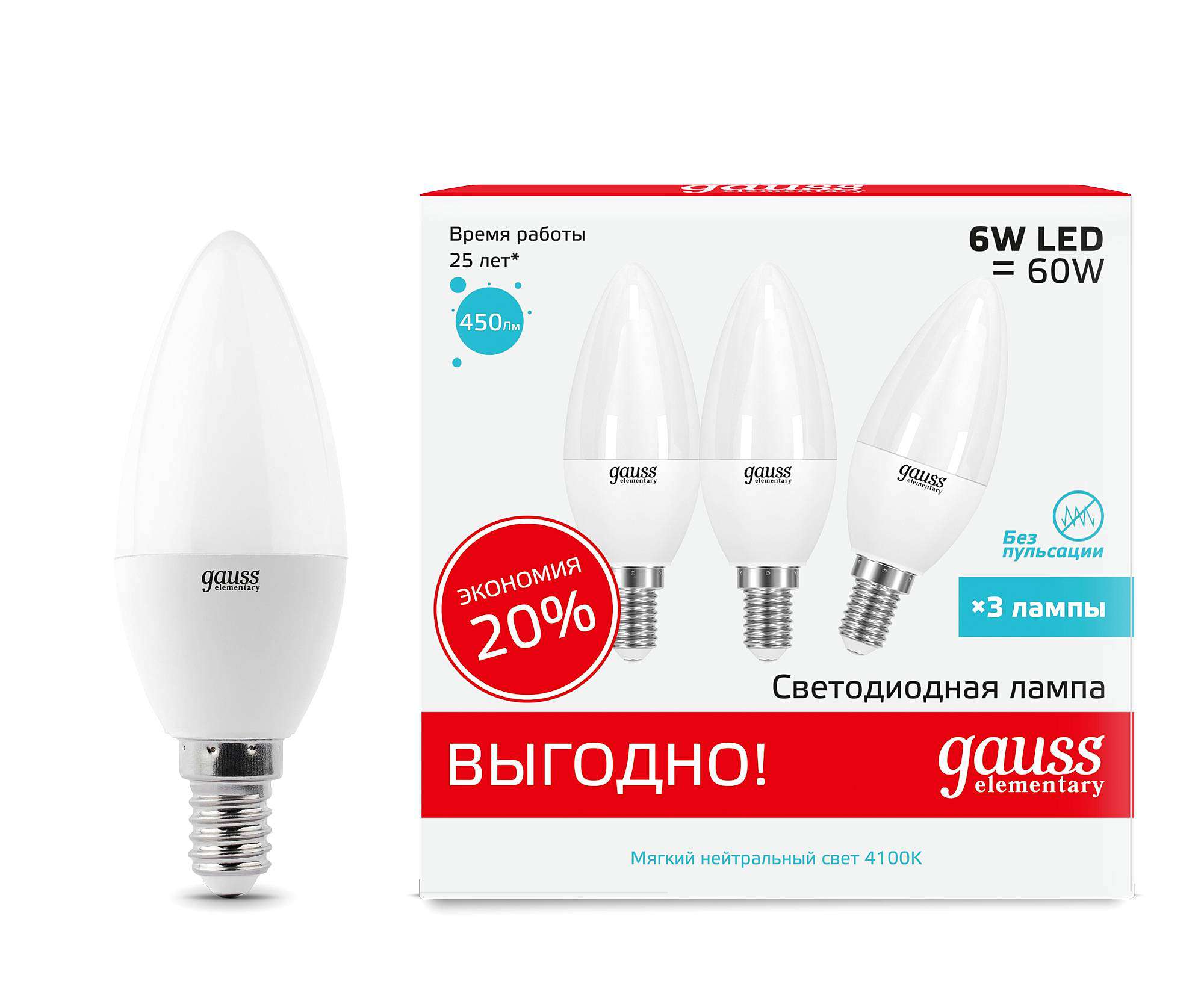 Лампа-СВЕЧА (Е27) 6.5 Вт 2700К, Gauss