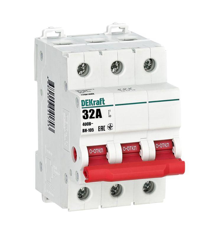 Выключатель-разъединитель серии ВН-105 Dekraft, 3-полюсный; номинальный ток 32 А, установка – на 35мм DIN-рейку, установочное положение - любое, с красной рукояткой управления. Высокие характеристики механической и электрической износостойкости. Категория применения AC-22A. Применяется для ручного включения/отключения сетей напряжением 400 В AC. Специальные мостиковые контакты обеспечивают надежный разрыв цепи; они полностью исключают возможность перекрытия дугой по изоляции.