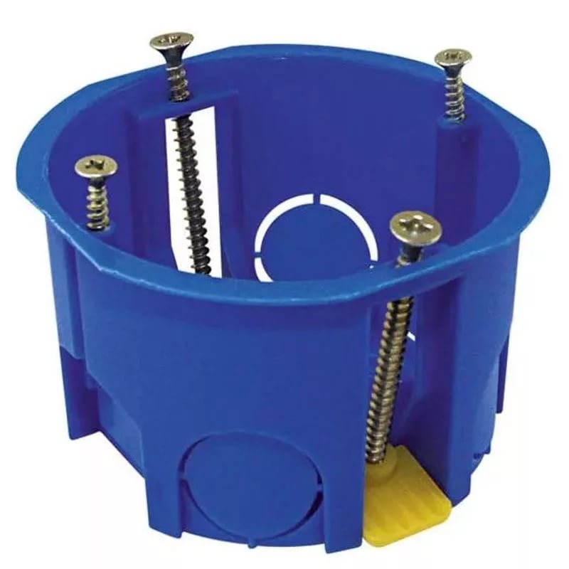 Применяется для установки розеток и выключателей в бетонные или кирпичные стены. Диаметр 68 мм, глубина 45 мм, синяя. Межцентровое расстояние — 71 мм. Подходит для всех видов выключателей, переключателей и розеток внутреннего монтажа. Для более быстрого и точного монтажа установочной коробки применяют коронку 68-70 мм. После сверления заводят кабель в коробку, затем с помощью штукатурки, алебастра или гипса коробку "вмазывают" в готовое отверстие в стене.