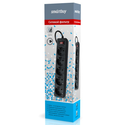 Удлинители, разветвители Сетевой фильтр 5 гнезд, 3 м 10А С/З, С/В, черный, Smarbuy